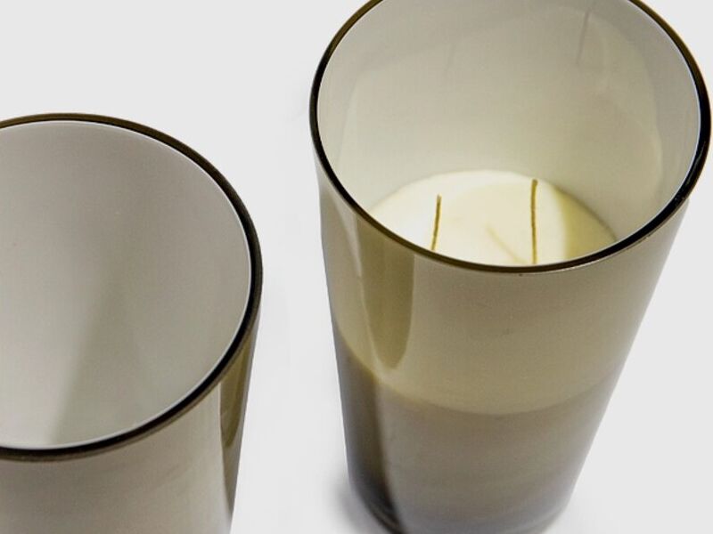 Vela en recipiente de vidrio pintado, color café.