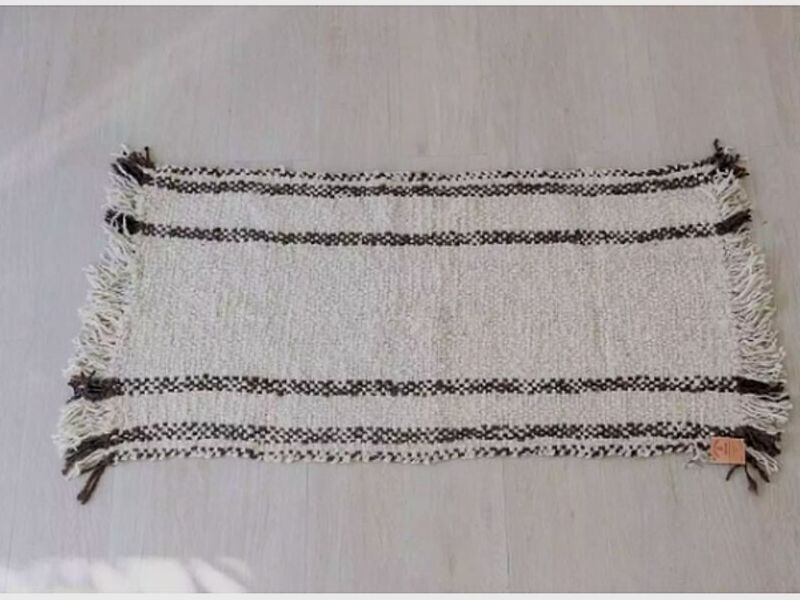 Alfombra tejida a mano con técnicas tradicionales en lana cruda. Hecha en pura lana de oveja con proceso manual desde la esquila hasta la pieza final. Diseño en color natural con diseño de rayas con terminación con flecos.