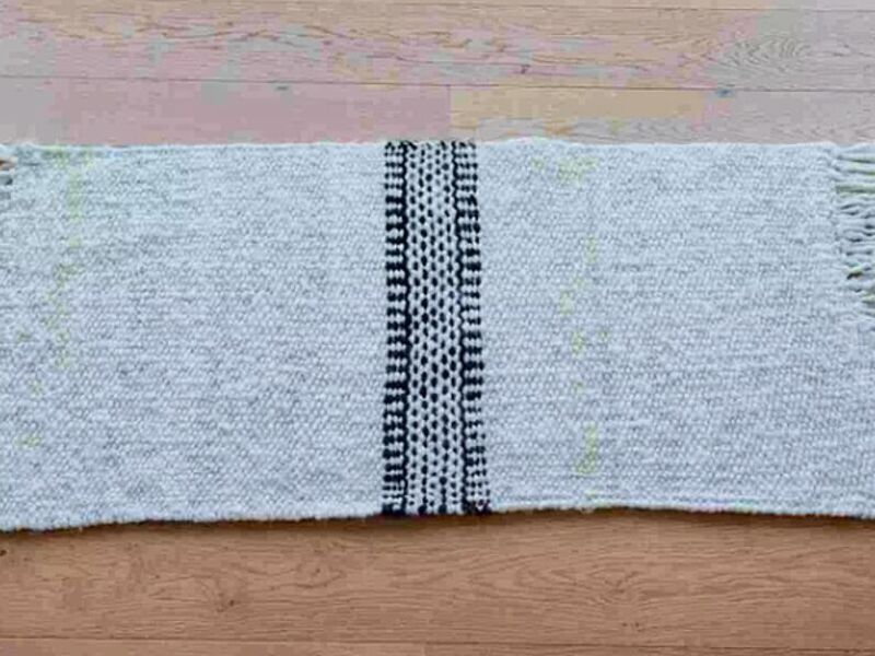 Alfombra tejida a mano con técnicas tradicionales en lana cruda. Hecha en pura lana de oveja con proceso manual desde la esquila hasta la pieza final. Diseño en color natural con detalle de guarda y terminación con flecos.