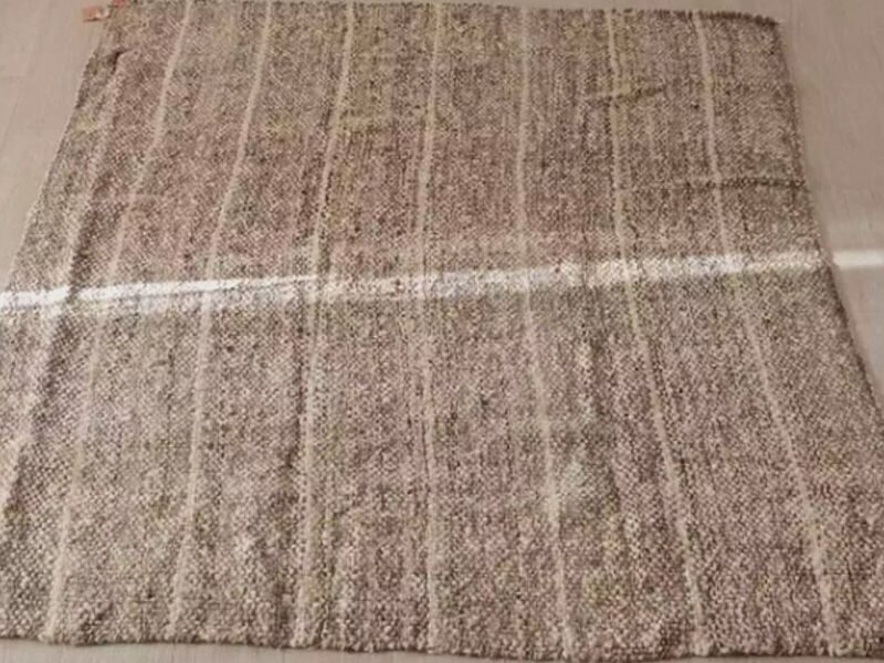 Alfombra tejida a mano con técnicas tradicionales en lana cruda. Hecha en pura lana de oveja con proceso manual desde la esquila hasta la pieza final. Diseño en color melange, mezcla de natural y gris con rayas naturales y terminación sin flecos.