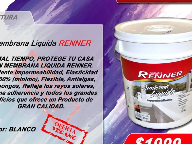 CON MEMBRANA LIQUIDA RENNER. Excelente impermeabilidad, Elasticidad de 400% (mínimo), Flexible, Antialgas, Antihongos, Refleja ios rayos solares, Optima adherencia y todos ios grandes Benticios que ofrece un producto de gran calidad.