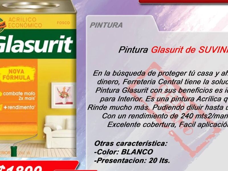 En la búsqueda de proteger tú casa y ahorrar dinero, Ferretería Central tiene la solución. Pintura Glasurit con sus beneficios es ideal para Interior. Es una pintura Acrílica que Rinde mucho más. Pudiendo diluir hasta un 20% Con un rendimiento de 240 mts2/mano. Excelente cobertura, Fácil aplicación