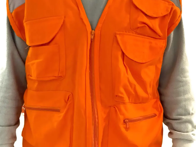 Chaleco reflectivo en tela gruesa, con dos franjas delanteras y traseras, 4 bolsillos delanteros, cierres reforzados.